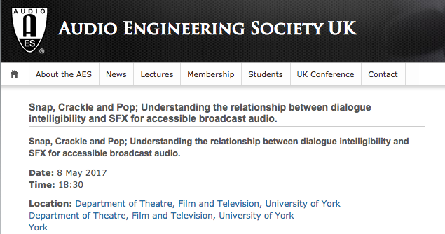 Screen Shot 2017-05-03 at 20.49.49 Published May 3, 2017 at 635 × 334 in Audio Engineering Society UK » Snap, Crackle and Pop; Understanding the relationship between dialogue intelligibility and SFX for accessible broadcast audio.